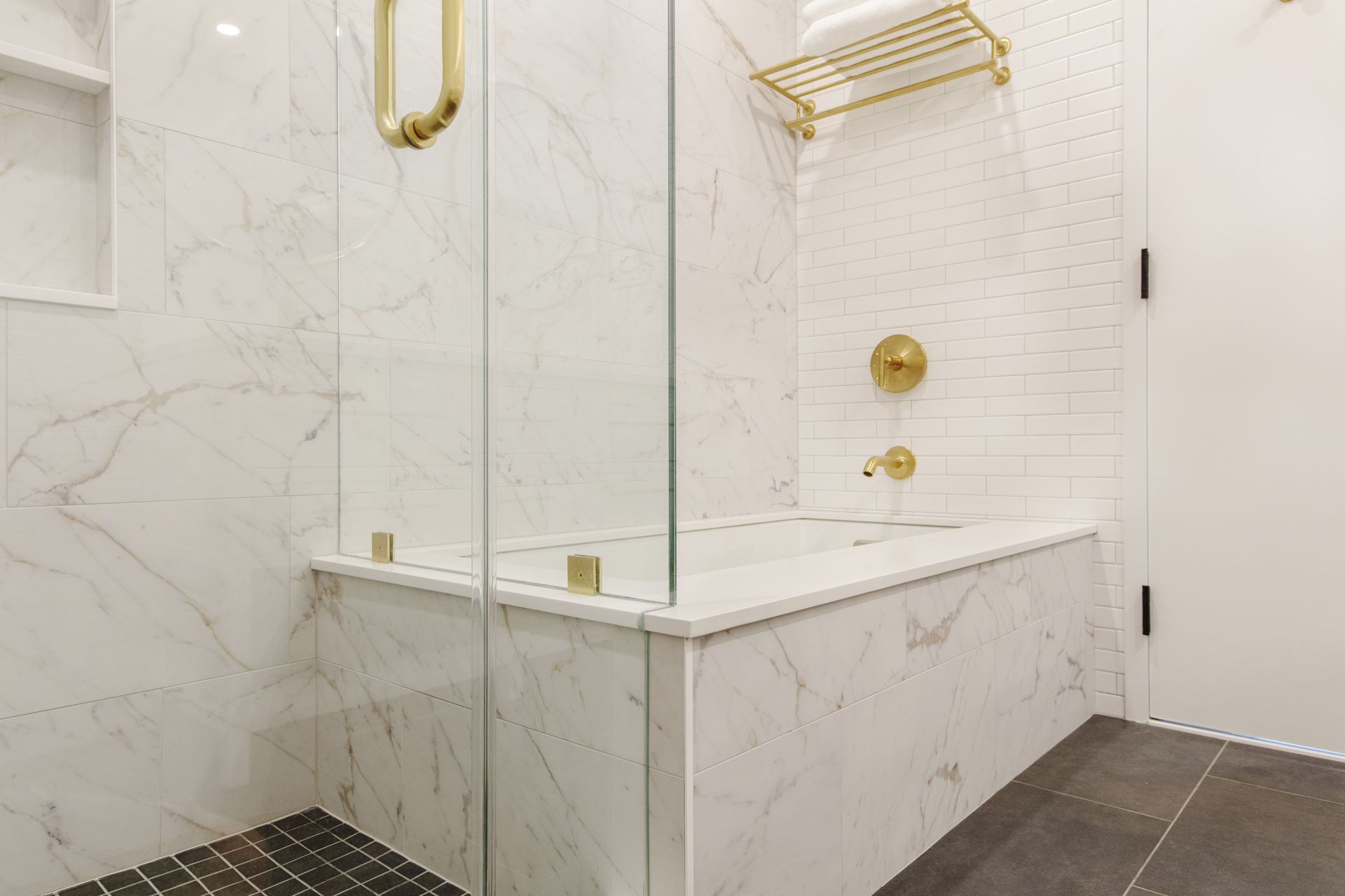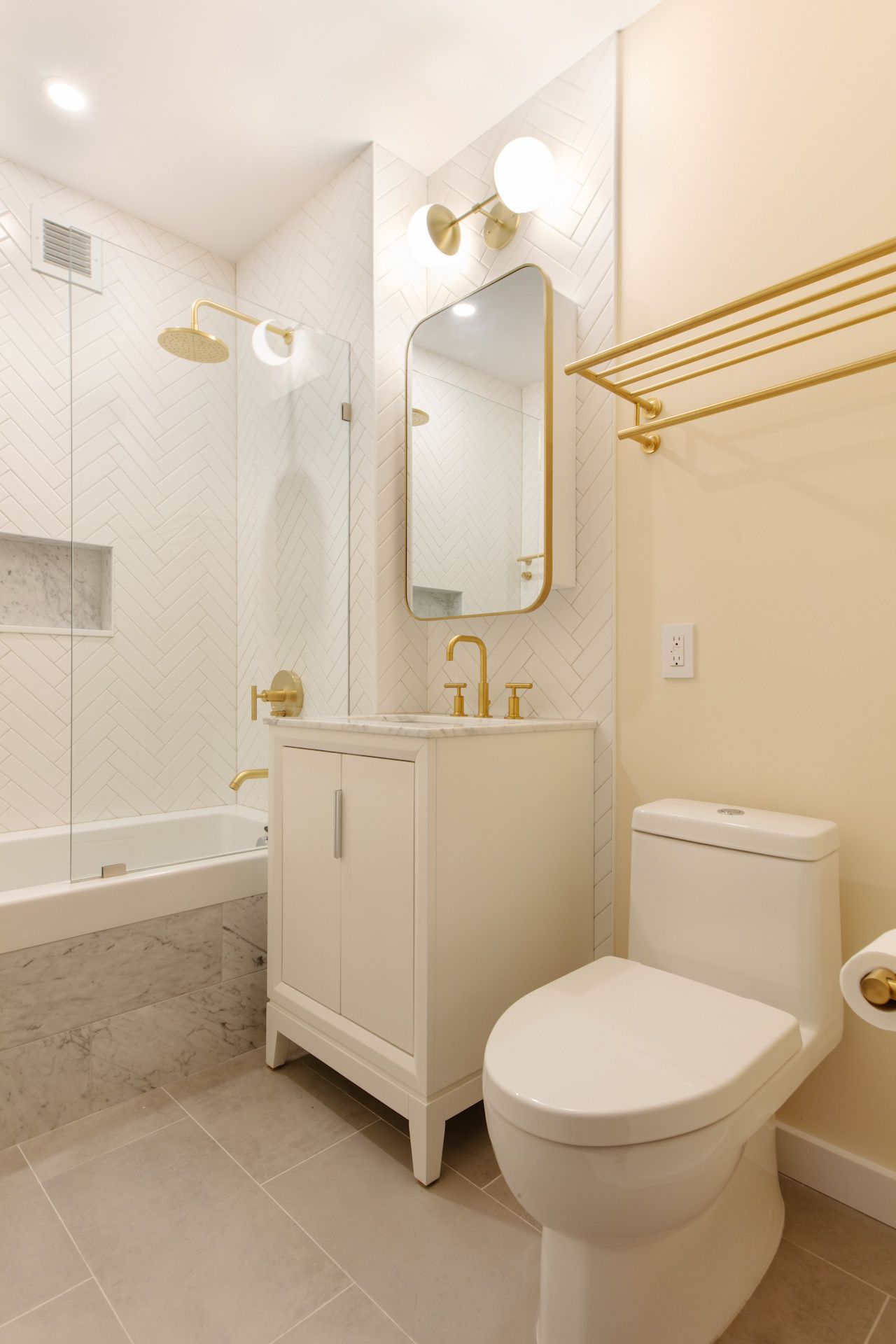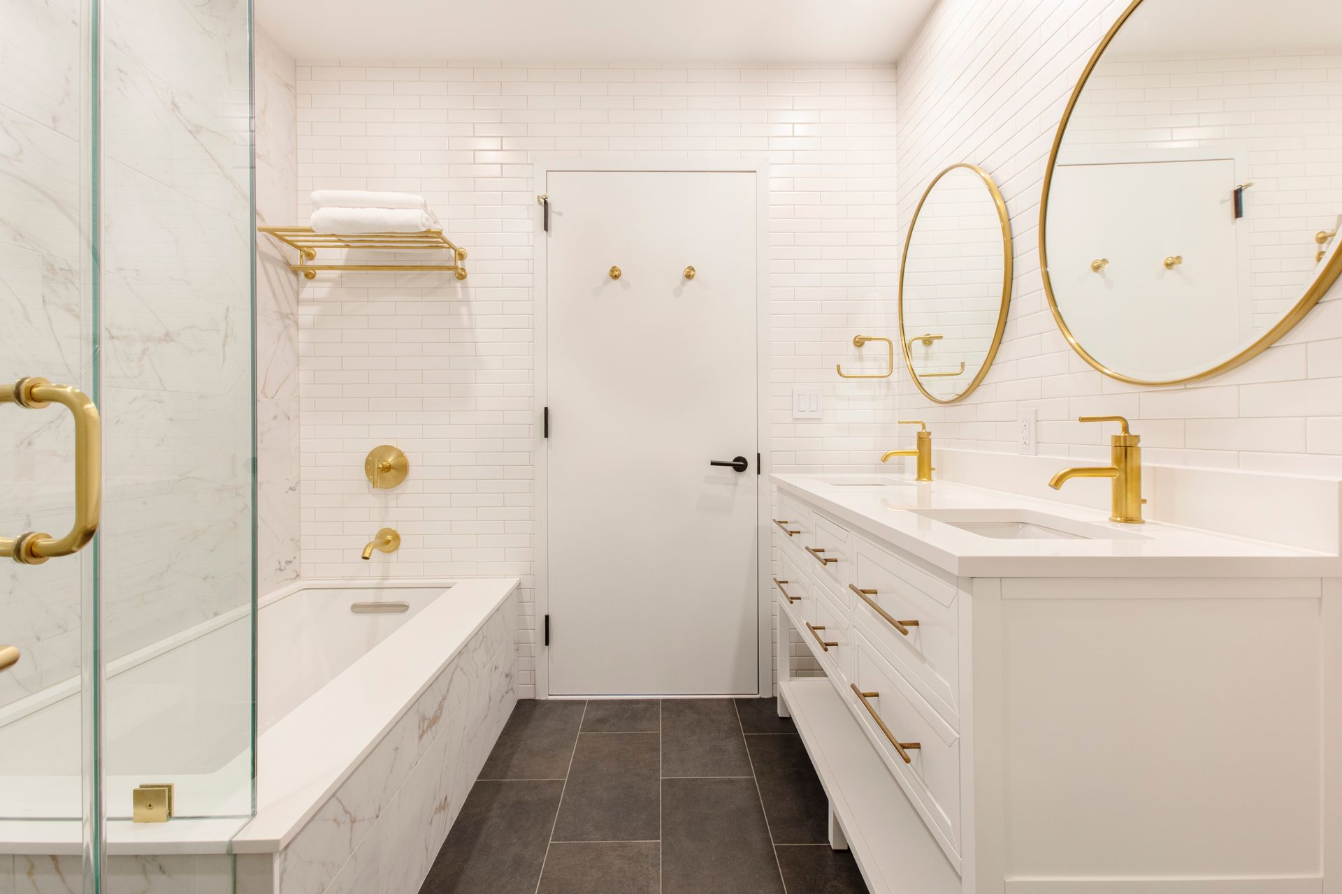 The clients bold taste is evident in the regal blue and white custom kitchen cabinets with contrasting bright white quartz counters. Master bathroom consisted of elegant white herring bone subway tile installed over a beautiful apron tub, and accented with gold fixtures. For the second bathroom, we installed another apron tub encased in marble which was also used as an accent wall and complemented with large subway tile laid in a brick pattern through out the remaining walls. We installed a double vanity and accented everything with the most beautiful gold Kohler shower body, faucets, handles and accessories. When it comes to style and design, this project is most certainly one for the books!